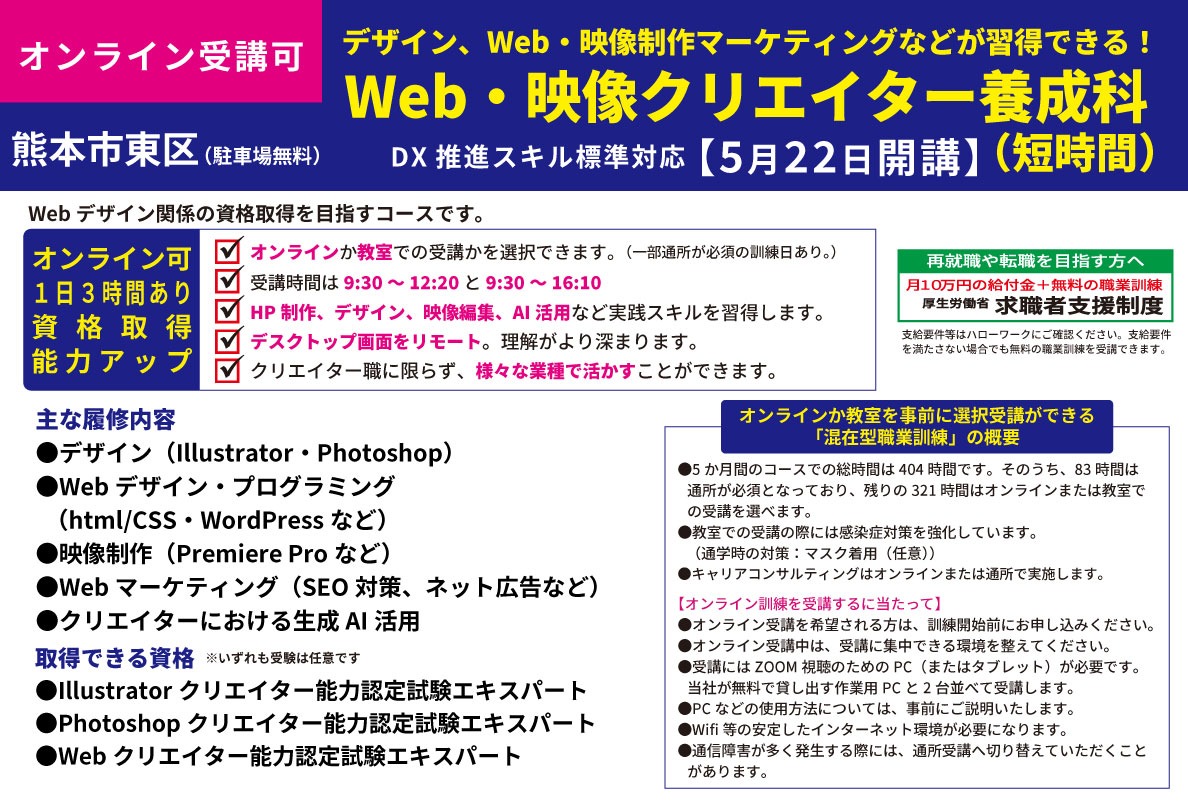【締切4/27まで!熊本市東区・駐車場無料】オンラインでも受講できる訓練「Web・映像クリエイター養成科(短時間)」
