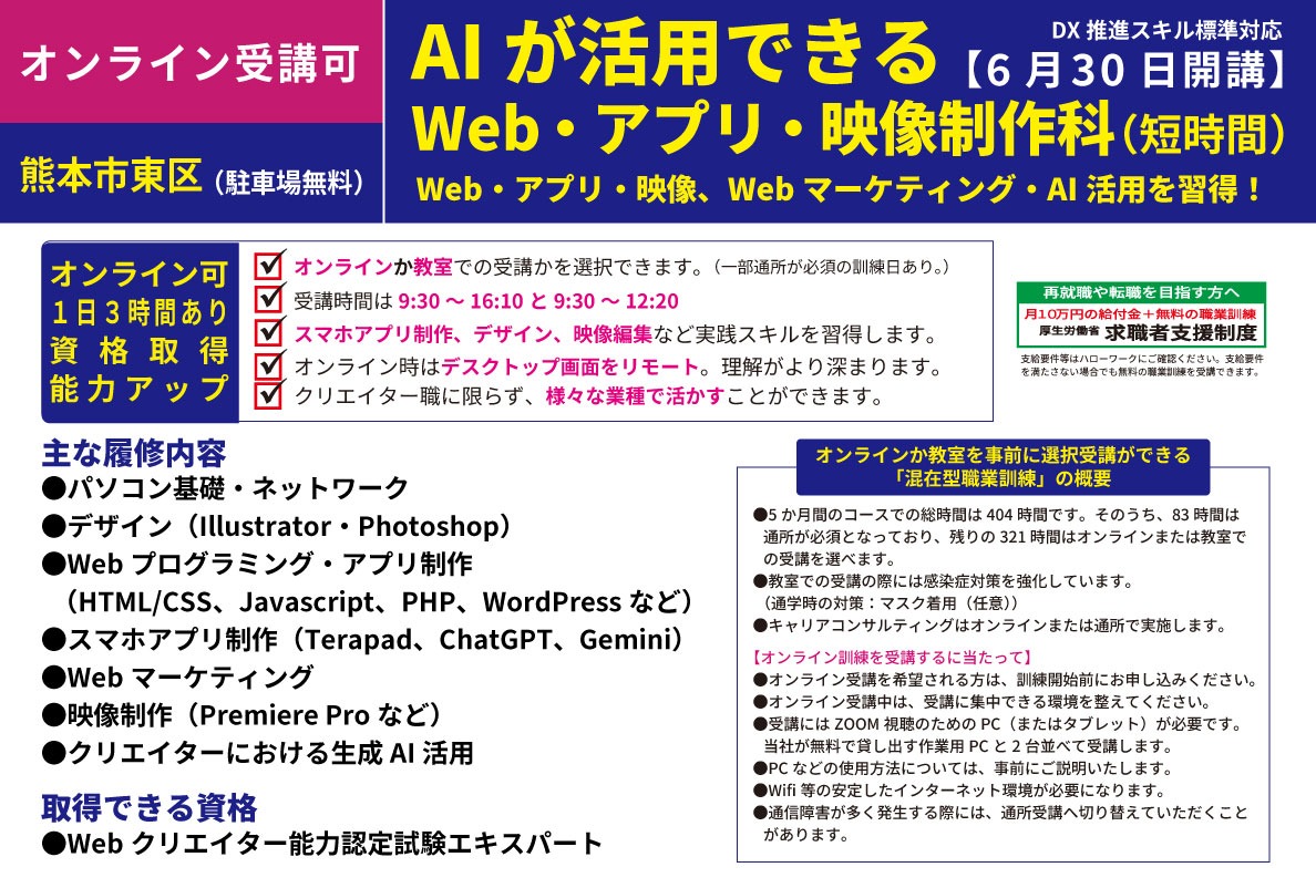 【締切6/9まで!熊本市東区・駐車場無料】オンラインでの受講できる訓練「AIが活用できるWeb・アプリ・映像制作科(短時間)」