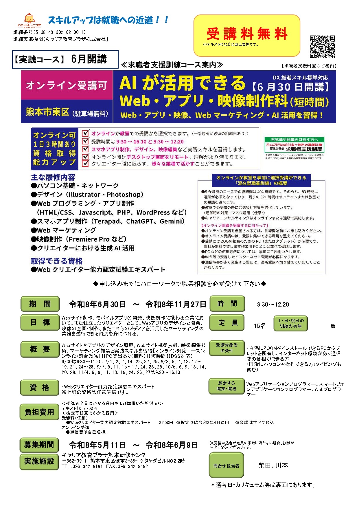 Web・アプリ・映像・マーケティング等が学べる職業訓練「AIが活用できるWeb・アプリ・映像制作科」(短時間)を募集しています。