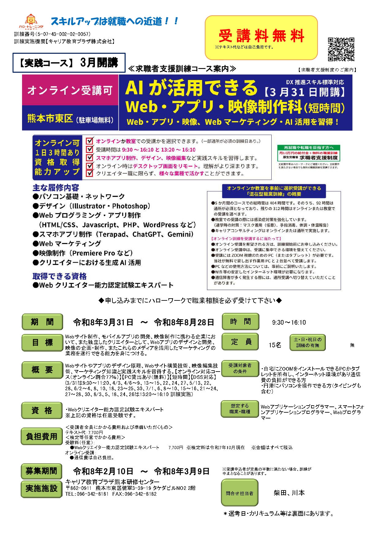 Web・アプリ・映像・マーケティング等が学べる職業訓練「AIが活用できるWeb・アプリ・映像制作科」(短時間)を募集しています。