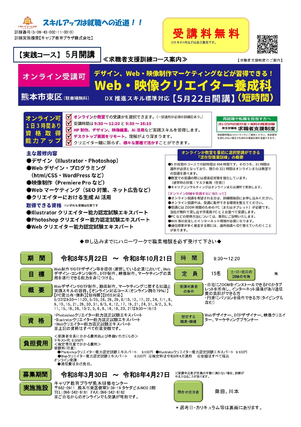 ホームページ制作、デザイン、映像編集、マーケティング等が学べる職業訓練「Web・映像クリエイター養成科」(短時間)を募集しています。オンラインでも受講ができる職業訓練です。
